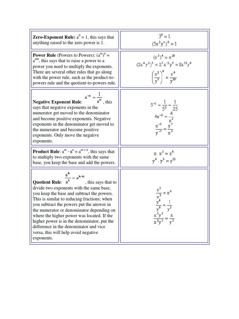 Power rule, quotient rule, zero rule, negative rule, how to use the exponent rules, examples with step by step solutions, how to simplify expressions with rules of the rules of exponent are: These are the two basic rules that we'll learn for now when it comes with dealing with exponents. Learn vocabulary, terms and more with flashcards, games and other study tools.